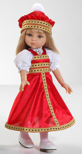 Варвара одета в пышный красный сарафан и белую рубашку, на ногах - белые колготки и туфли-лодочки. На голове - шапочка с помпоном в тон сарафану.